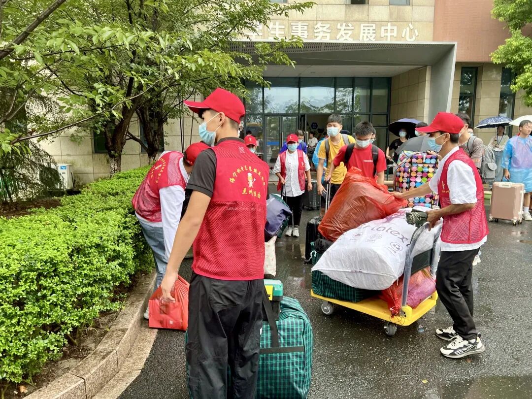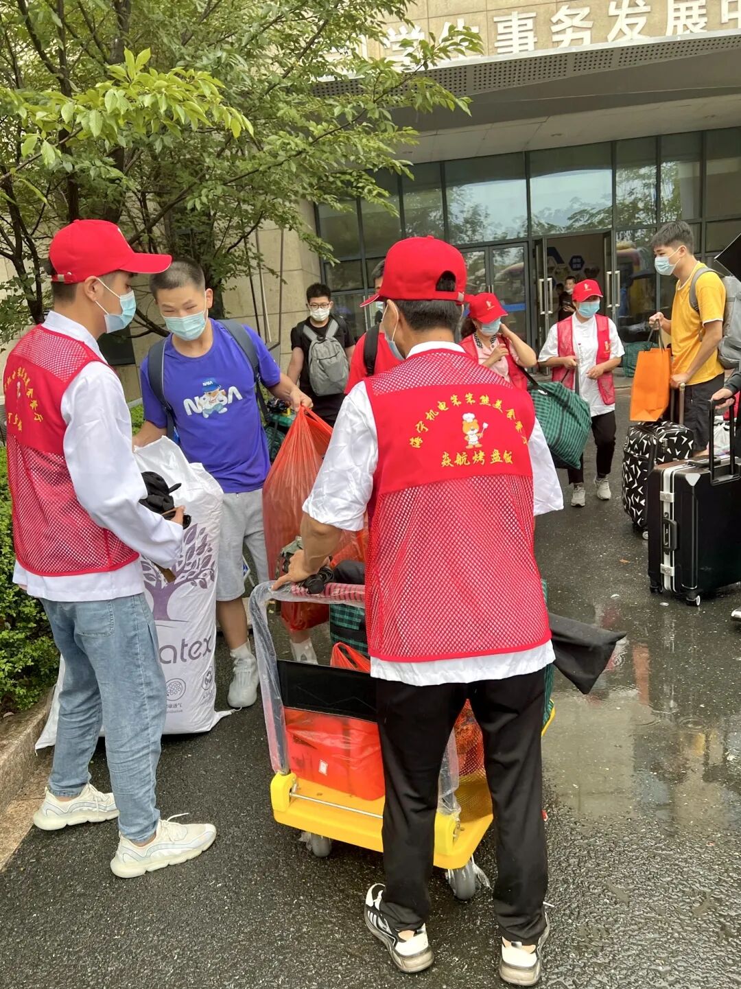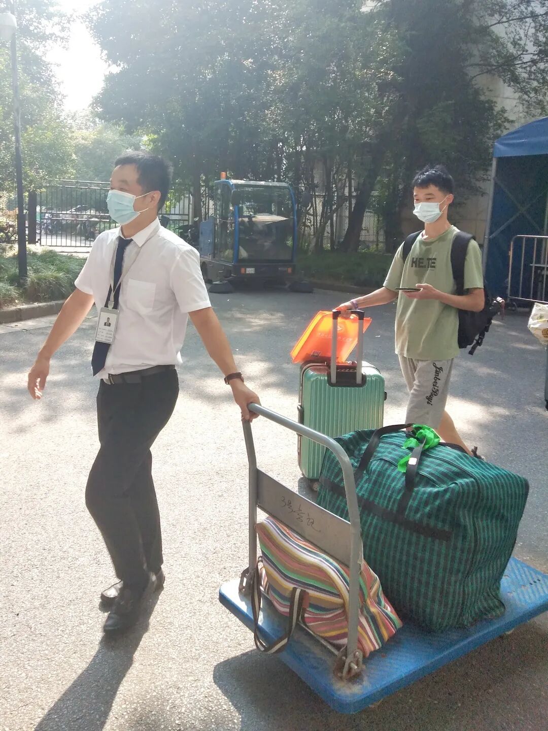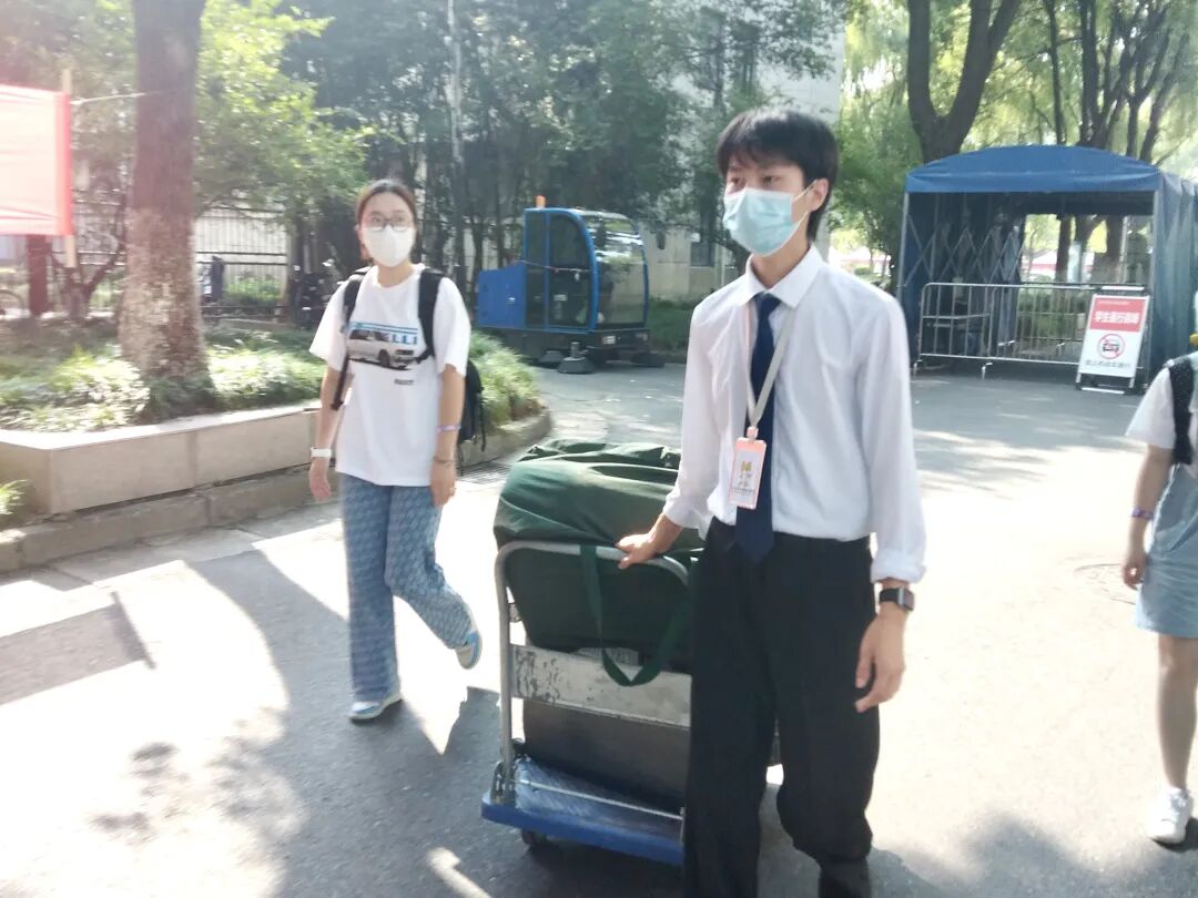 迎新当天,笨笨熊餐厅的工作人员们一早就在校门口等候新生们的到来,他们热情地接过新生手中的行李,通过小推车帮助新同学们把沉重的行李运送到寝室。